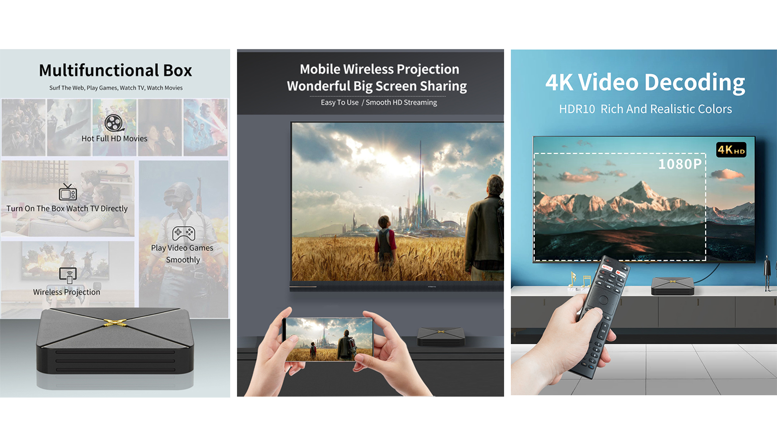 HLQ-Plus use the 12nm Amlogic S905 series chip, with DDR4 2GB /4GB running memory, supports 4K 60Fps video decoding and output resolution, dual-receive and dual-transmit 2.4Ghz+5.8Ghz Wifi, can smoothly play online IPTV or other streaming videos, and can also run as an advertising machine 24/7, supporting screen rotation function.